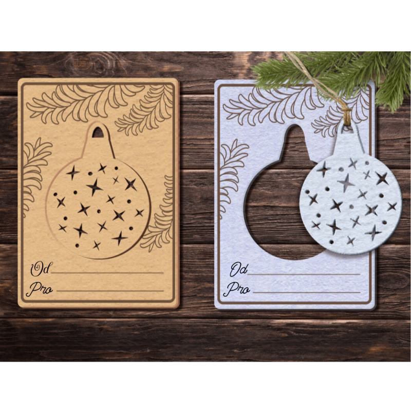 Dřevěné Vánoční přání s okrasným vylamovacím přívěskem na stromeček - Baňka