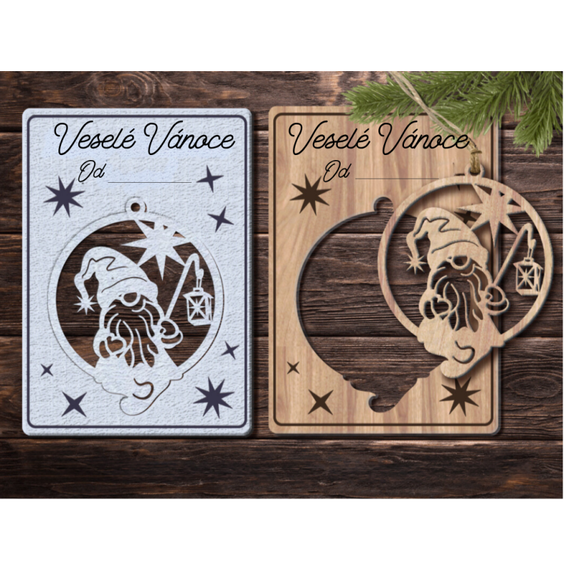 Dřevěné Vánoční přání s okrasným vylamovacím přívěskem na stromeček - Vánoční skřítek