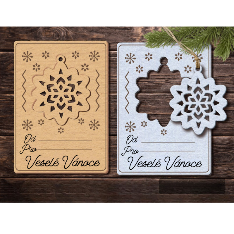 Dřevěné Vánoční přání s okrasným vylamovacím přívěskem na stromeček - Vločka