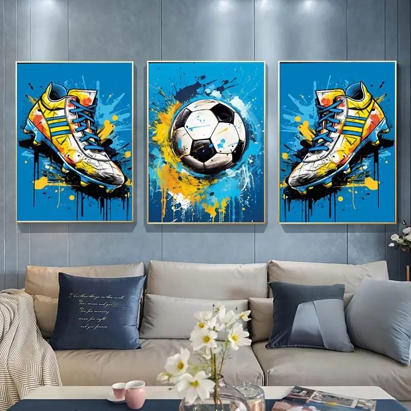 Tyto originální obrazy na plátně s motivem fotbalu jsou ideální volbou pro všechny s fotbalovou vášní. S tímto setem můžete oživit zdi ve vašem domě a přidat do obývacího pokoje, dětského pokoje nebo pracovny šmrnc. Motiv fotbalového míče a dvou kopaček dodá vašemu interiéru sportovní atmosféru. Obrazy si můžete libovolně pověsit či nalepit na zeď dle své fantazi.
