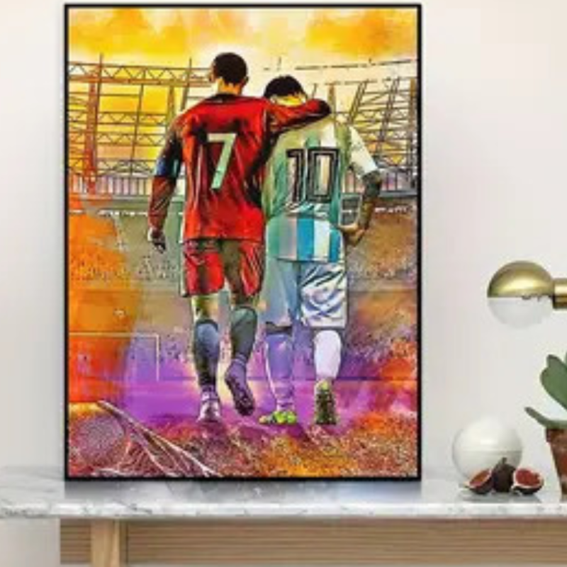 Tento obraz na plátně v rámu s motivem fotbalových hvězd Ronalda a Messiho je skvělým doplňkem pro všechny fotbalové nadšence. Tento originální obraz může být umístěn v obývacím pokoji, pracovně nebo dokonce v dětském pokoji, aby vytvořil fotbalovou atmosféru přímo ve vašem domě.