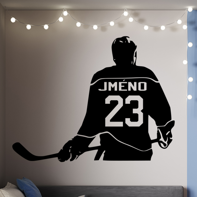 Tato samolepka na stěnu je ideální volbou, jak oživit interiér dětského pokoje a je vhodná pro všechny fanoušky a hráče hokeje. Oživte svůj interiér s naší exkluzivní samolepkou hokejového dresu. Její design připomínající hokejistu skvěle zapadne do prostoru každého dětského pokoje, obývacího pokoje, pracovny a přinese autentickou hokejovou atmosféru. Samolepka je určená především pro kluky, kteří chtějí vytvořit svůj vlastní hokejový koutek. Vyberte si své jméno a číslo, které bude figurovat na samolepce a přeneste se přímo do atmosféry hokejového zápasu.