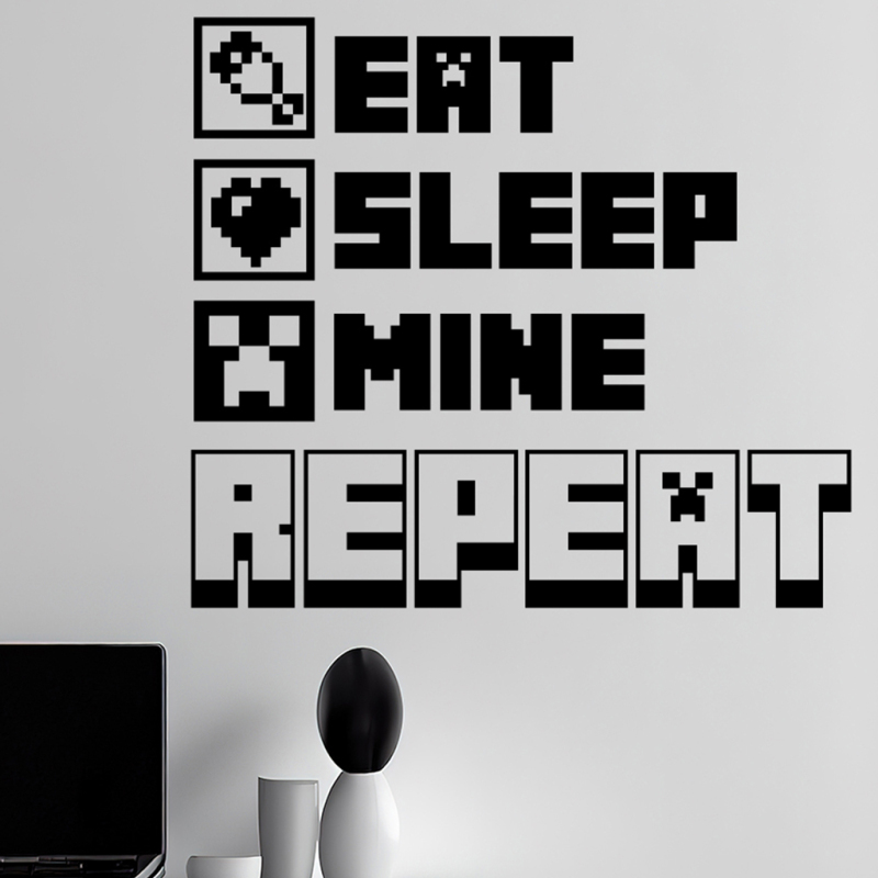 Samolepka na zeď Minecraft s nápisem Eat, Sleep, Mine, Repeat.
