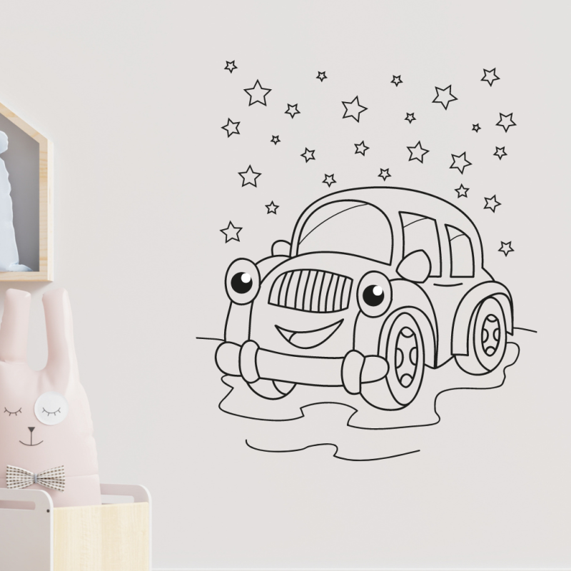 Autíčko. Samolepka obsahuje motiv autíčka i s hvězdičkami. Je vhodná do dětského pokoje, ale také na dveře nebo nábytek. Samolepky vyrábíme z kvalitních německých folií. Samolepky dodáváme včetně přenosové folie pro snadné nalepení.
