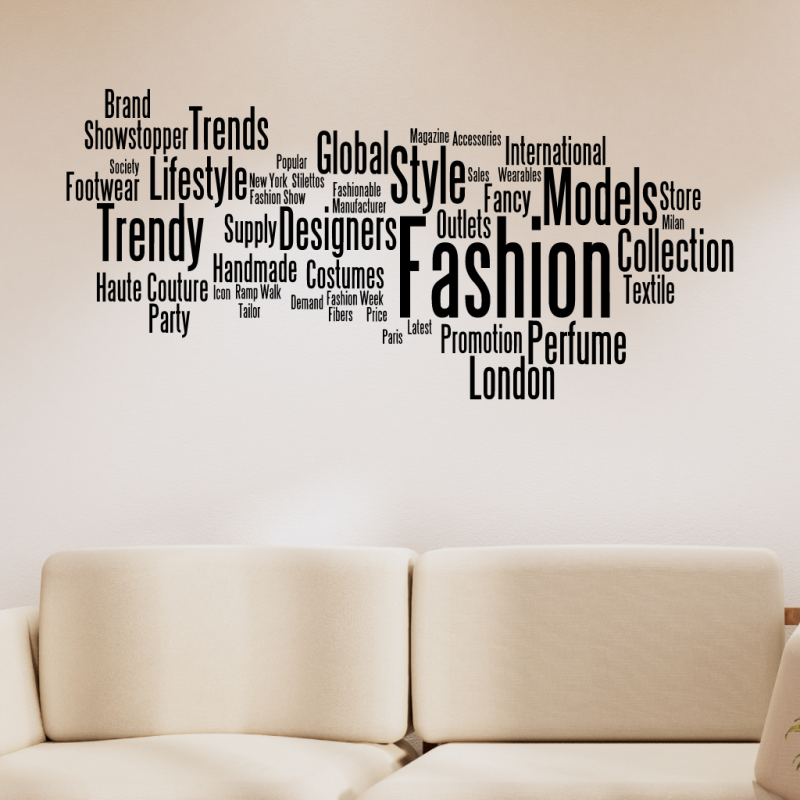 Fashion mapa. Samolepka s nápisy, která je vhodná do ložnice, obývacího pokoje nebo pracovny. Samolepky vyrábíme z kvalitních německých folií. Samolepky dodáváme včetně přenosové folie pro snadné nalepení.