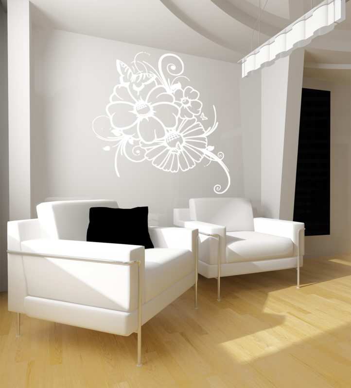 Motýlci na kytce. Krásné květy, motýlci, prostě romantika. Tato samolepka je vhodná do ložnice, obývacího pokoje nebo pracovny. Samolepky vyrábíme z kvalitních německých folií. Samolepky dodáváme včetně přenosové folie pro snadné nalepení.