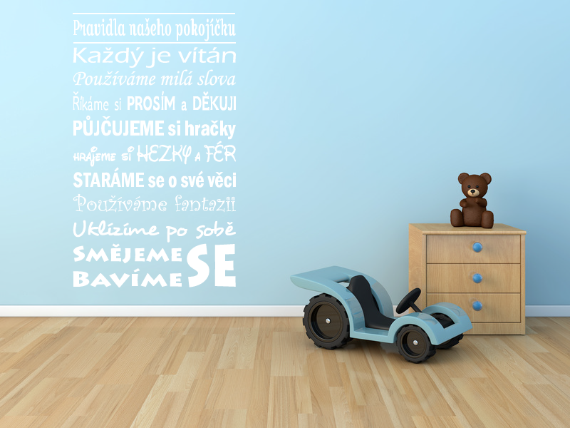 Připomeňte svým dětem základní pravidla. Nalepení je jednoduché a z výsledku budete mile překvapeni.Samolepky vyrábíme pouze z originál wall art folie. Přenosová folie je součástí balení zdarma.