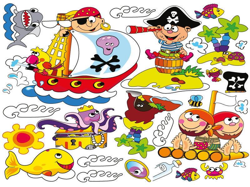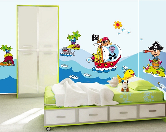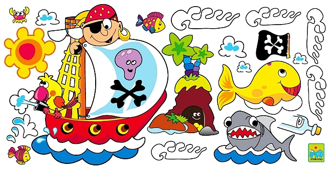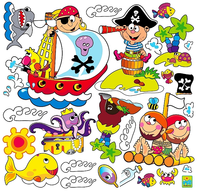 Náramné samolepící dekorace v pirátském stylu. Jednoduše a snadno promění celý dětský pokoj. Snadná aplikace na různé hladké povrchy, zeď, nábytek, sklo, dveře atd.., Dva archy o rozměru 120 cm x 50 cm.