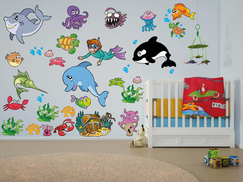 Hledáte-li vhodný motiv k výzdobě pokoje vašeho potomka, pak jste na té správné adrese. Samolepka na zeď, kterou právě sledujete, zachycuje kreslenou formou mořský svět, a je tudíž pro dítě zajímavá, inspirující i poučná. Díky sympatickým kresbám a pestrým barvám působí vesele a poutá dětskou pozornost, zároveň je ale také poučná, neboť ukazuje podmořský život s širokou škálou různých živočichů, od nebezpečného žraloka, přes chobotnici, kosatky, delfína, až po hvězdice či želvu. Dítěti nabízí řadu zajímavých podnětů, a vám poslouží jako skvělé oživení interiéru. Pokud jste navíc fanoušky mořského světa, není nad čím dále váhat... Ideálně se bude samolepka vyjímat na modrém podkladu, který ještě podpoří dojem mořského světa.