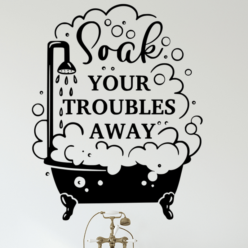 Tato originální samolepka na zeď „Smyj svoje problémy“ je ideálním řešením pro ty, kteří chtějí oživit svůj interiér a přinést do svého domova svěžest a nový design. Tato samolepka obsahuje citát „Soak your troubles away“, což znamená, „Smyj své problémy“. Samolepka na stěnu se velice hodí do každé koupelny, ale nalepit ji můžete i na sklo či nábytek.